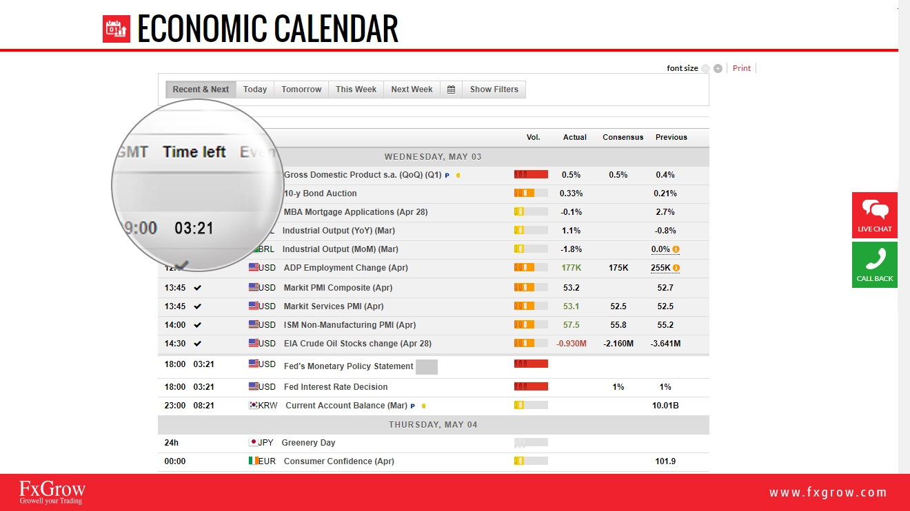 FxGrow is excited to inform you that we have updated our economic calendar with a new interactive version. This version is more interactive and more detailed. Please check below how to read and anticipate data before and after the release from left to right. You have the choice either to choose recent and next economic news, today's full economic news, tomorrow's economic news, weekly economic news, and also next week if you are looking for expanding your research. Also, if you click on filters, you can choose countries that you wish to see their economic release depending on your trading instruments.