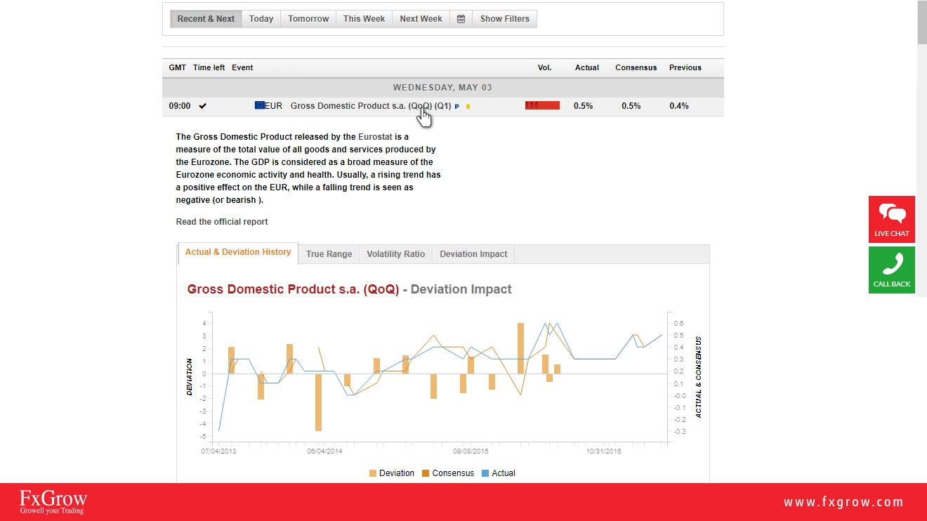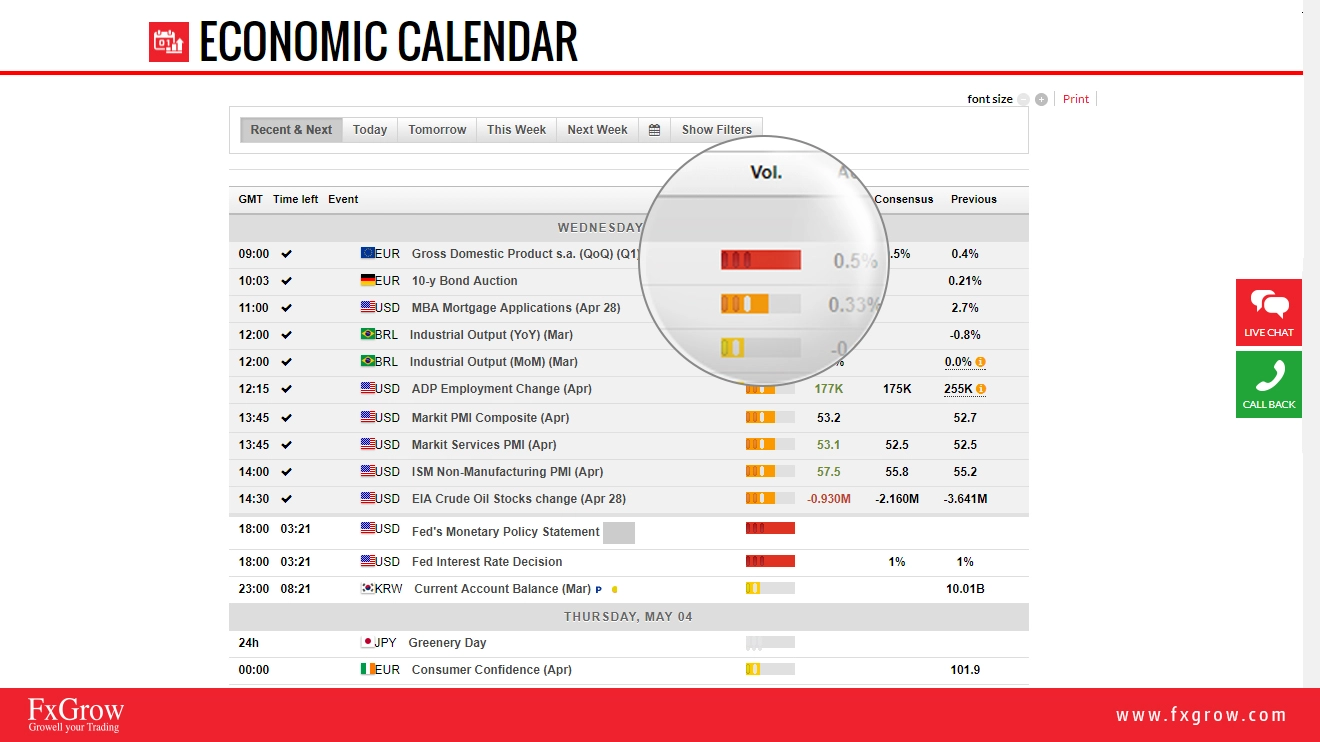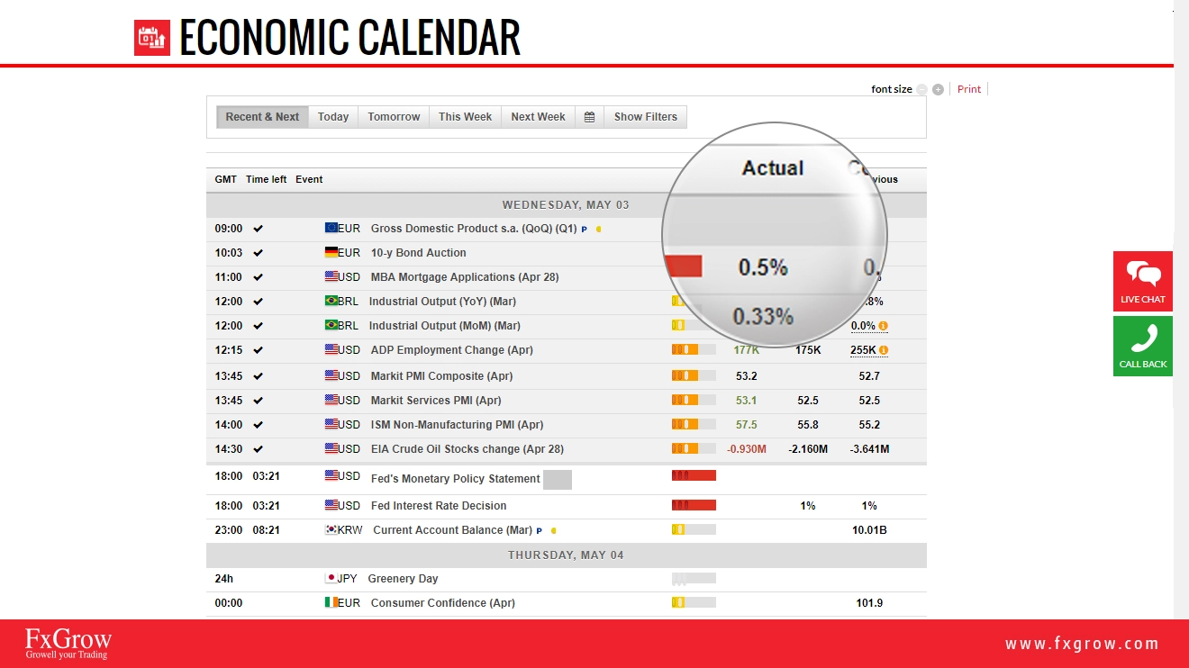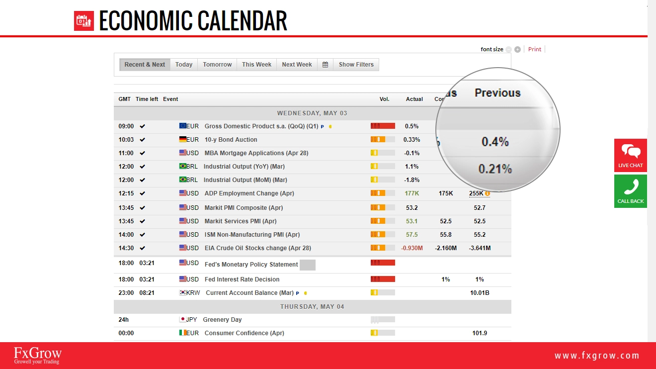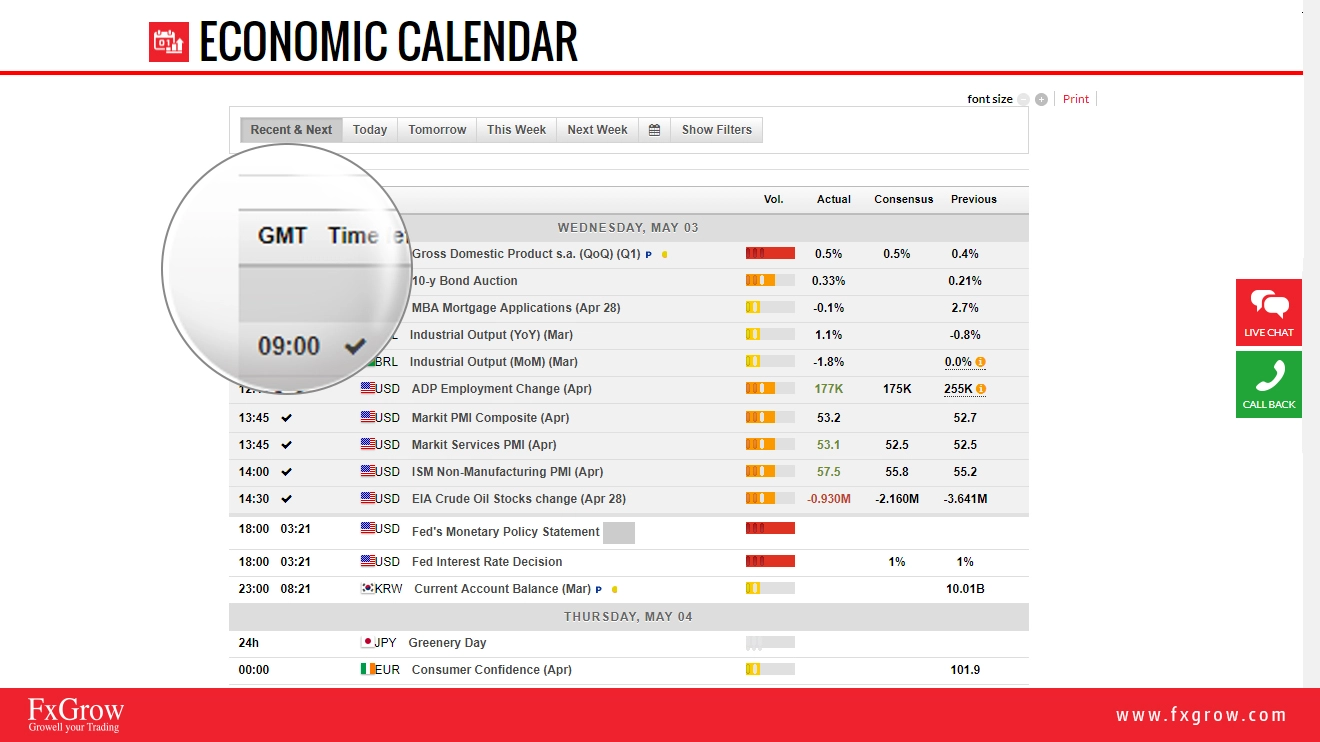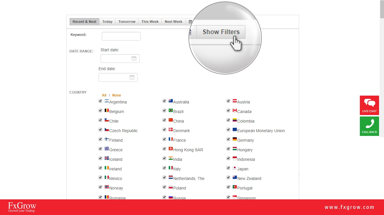 FxGrow is excited to inform you that we have updated our economic calendar with a new interactive version. This version is more interactive and more detailed. Please check below how to read and anticipate data before and after the release from left to right. You have the choice either to choose recent and next economic news, today's full economic news, tomorrow's economic news, weekly economic news, and also next week if you are looking for expanding your research. Also, if you click on filters, you can choose countries that you wish to see their economic release depending on your trading instruments.