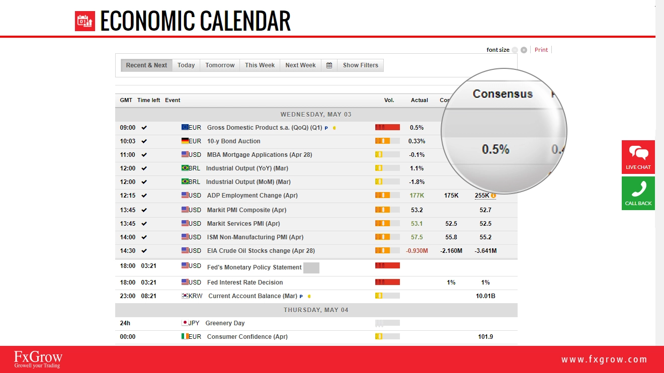 6- Consensus: It means the forecasts for possible outcome of the economic data. As the word forecasts means, the data mentioned is an expectation or possible outcomes, the expected data is not accurate and the data about to be released can either be lower, higher, or the same result.